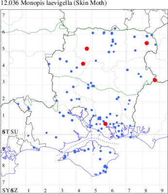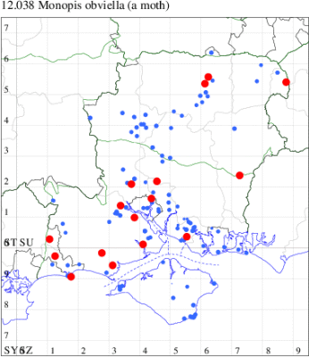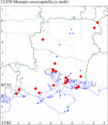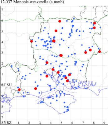 VC12: Anna Valley, Andover, one, 02 Sep (TJN); Morn Hill, Winchester, one, 02 Sep (CRB, PDF, DAS); Hinton Ampner, one, indoors, 28 Jun (ASD); Morn Hill, Winchester, two, 09 Sep; one, 15 Sep (CRB, PDF, DAS, LHur); Selborne, two, 08 Sep; two, 08 Sep (CJP); Fleet Pond, one, 07 Jul; one, netted, 03 Sep; one, 06 Sep (MHals)