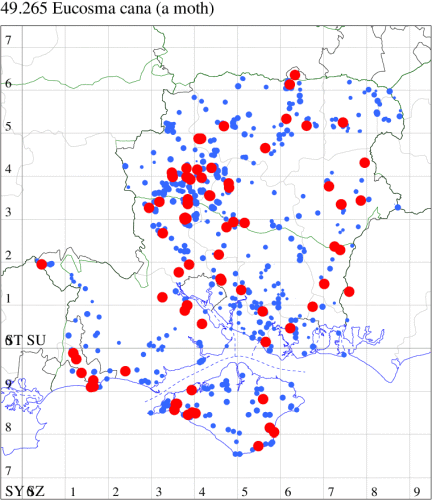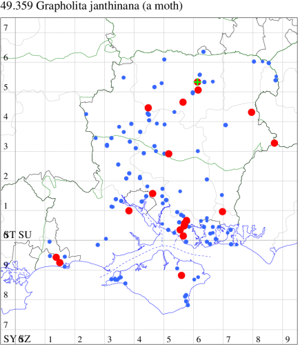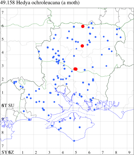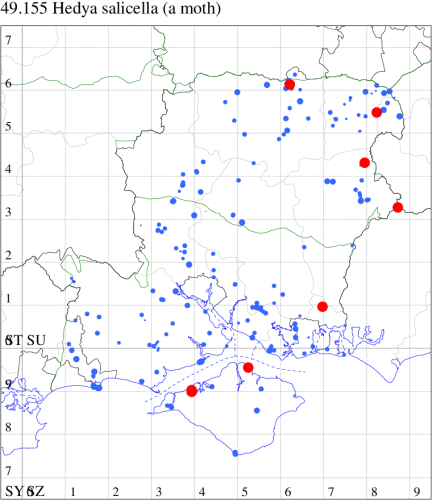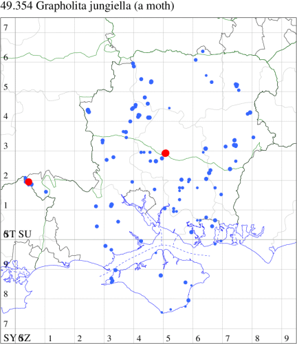 VC11: Howen Bottom, NF, one, 22 Jul (AMD); Pig Bush, NF, one, 24 Jul (NRJ); Woodlands, NF, one, 12 Aug (RBW); Romsey, three, 20 Jul; one, 23 Jul (NRJ); Bevois Valley, Southampton, present, 29 Jul; present, 30 Jul (MCrei); Swaythling, Southampton, one, 30 Jul (MEdg); Southampton, one, 19 Jul; one, 31 Jul (MGP); Itchen Valley CP, one, 19 Jul (CTha); Allbrook, one, 17 Aug (SIng); Botley Wood, one, 05 Aug (AMD); Funtley, one, 01 Aug (TDC); Fareham, one, 24 Jul (IMcP); one, det gen, 01 Sep (MLO det. RJD); Pigeon House Coppice, Boarhunt, one, male det gen, 12 Jul (F.M.G. det. RJD); Portchester, one, 31 Jul; one, 12 Aug (CEH, JGS); Waterlooville, five, 15 Jul; two, 26 Jul; four, 01 Aug; three, 04 Aug; one, 07 Aug; one, 13 Aug; two, 15 Aug; one, 19 Aug; two, 26 Aug (DWhe); Hurn, one, 01 Aug (MJef); Hengistbury Head NNR, one, 01 Aug (HengistH det. RPH); Hengistbury Head, one, 30 Jul; four, 18 Jul; one, 27 Aug (MJef); Sway, one, 31 Jul; one, 28 Aug (SKee);