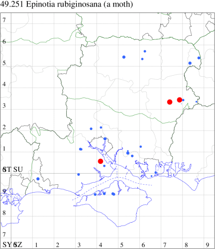 For the maps, all records prior to 2024 are shown by a blue dot (the larger the dot, the more recent), with the current year's records shown in red. As previous records are superimposed on any report for 2024, new sites have greater emphasis (i.e. will show as 'more red').