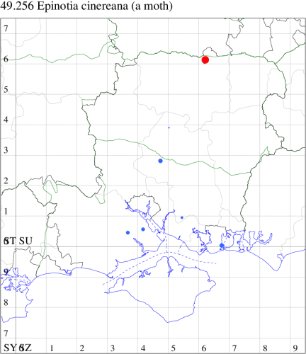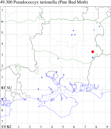 VC11: Millyford Bridge, one, netted, 31 Mar (AMD); Pig Bush, NF, one, 09 May; Romsey, one, 10 May (NRJ); Pigeon House Coppice, Boarhunt, one, det gen, 10 May (F.M.G. det. RJD); Flagpond Copse, Wickham, one, field obs., 20 Apr (DPH); The Moors NR, Bishop's Waltham, one, field obs., 25 Apr (DTru); Waterlooville, two, 30 Apr; one, to pheromone lure, to ARG lure, 04 May; one, 12 May (DWhe); Hengistbury Head NNR, one, 10 May (MJef); New Milton, one, field obs., 02 Apr (SKee);