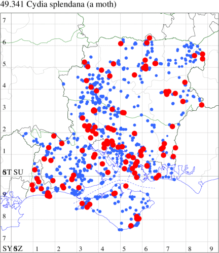 VC11: Linford Bottom, two, 05 Aug (CLew); Frogham, one, 16 Jul (NTO); Romsey, one, 02 Aug (NRJ); Dibden Purlieu, NF, one, 27 Aug (RAC); Allbrook, one, 28 Jul; one, 10 Aug; one, 11 Aug (SIng); Botley Wood, one, 05 Aug (AMD); Dean, Bishop's Waltham, present, 22 Jul; present, 30 Jul (CMor); Waterlooville, one, 04 Jul; one, 01 Aug; one, 07 Aug; three, 13 Aug; one, 15 Aug; two, 17 Aug; two, 24 Aug; three, 26 Aug; three, 27 Aug; three, 29 Aug (DWhe); West Walk, seven, 23 Aug (F.M.G.); Southleigh Forest, three, 22 Aug; five, 04 Jul (CGree det. HMun); Merritown Heath, one, 29 Jun; present, 17 Aug (DFoo);
