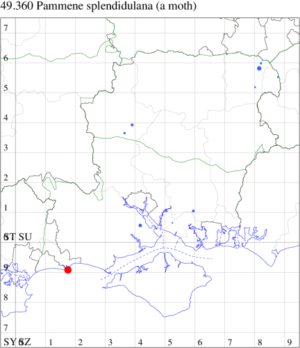 Local in beech woodland across much of southern England. Fairly widely, but sparsely distributed across much of Hampshire and on the Isle of Wight. Wingspan 10-12 mm. The relatively slender and attenuate forewing and the obscure and poorly defined fasciate markings and costal strigulae distinguish this species from S. nitidana [Bradley]; confusion with Pammene germmana is also possible. Larva feeds on Beech, living between leaves spun together with silk, and over-wintering as a pupa.