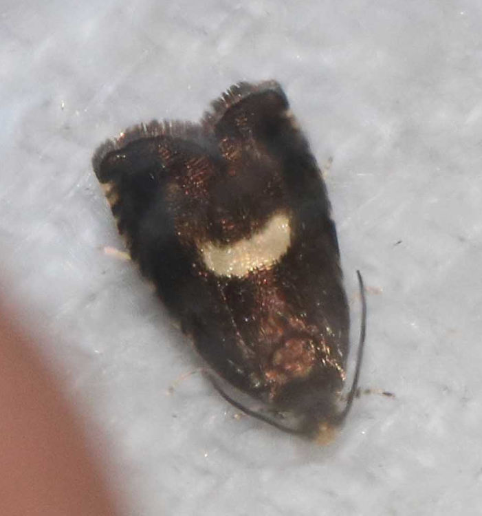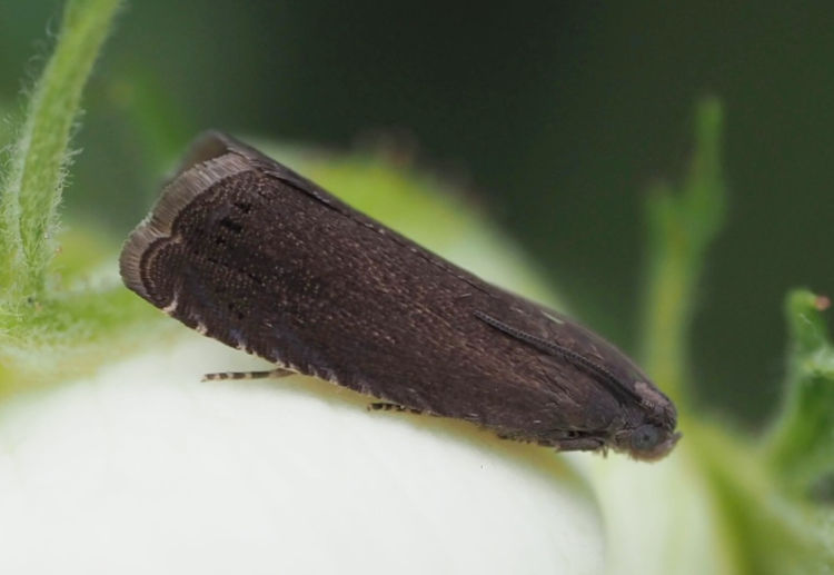 Local in woodland, gardens, orchards, parks and scrub throughout much of Britain and southern Ireland. In Hampshire and on the Isle of Wight recorded in small numbers from all three vice-counties, but until recently only in southern Hampshire; it appears to be very local. In North Hampshire, Goater (1974) contains undated references to it being scarce in the Itchen Valley, and at Chilbolton: confirmed records from the north-east around Fleet in 2022 and 2023 give more concrete evidence that this species has a foothold in the county. Wingspan 10-14 mm. Distinguished from G. funebrana by the greyish white labial palpi and frons and the comparatively uniform purplish fuscous general coloration of the forewing [Bradley]. Larva feeds within fruit of Dog-rose and Cultivated Rose, over-wintering in a cocoon.