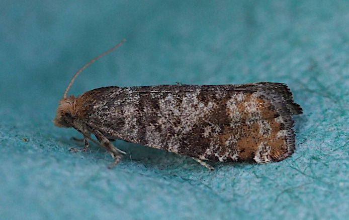 Local in gardens, orchards and hedgerows throughout much of southern England, southern Wales and southern Ireland. In Hampshire and on the Isle of Wight fairly widespread and not uncommon in gardens where there are plum trees, but apparently largely absent from the New Forest, and on the Island confined to the extreme west. Wingspan 10-15 mm. Similar to G. molesta but generally larger; distinguished from G. tenebrosana by the darker, greyish fuscous labial palpi and frons and the whitish irroration in the distal and medio-dorsal areas of the forewing [Bradley]. Larva feeds within fruit of Plum, Blackthorn, Wild Cherry and similar, over-wintering in a cocoon.