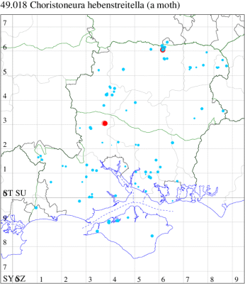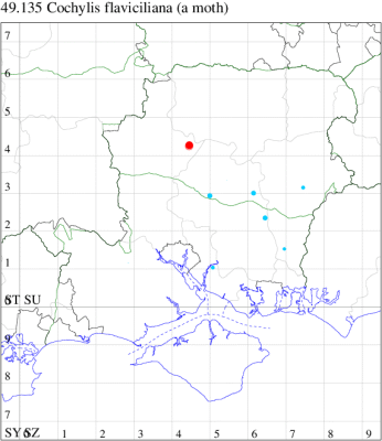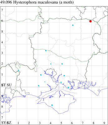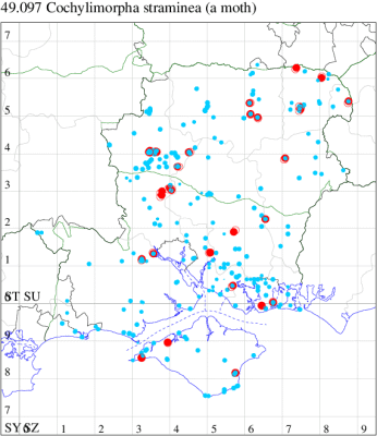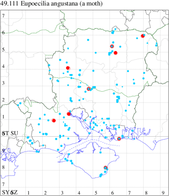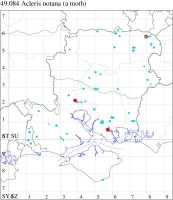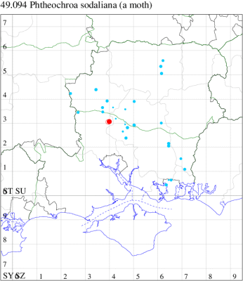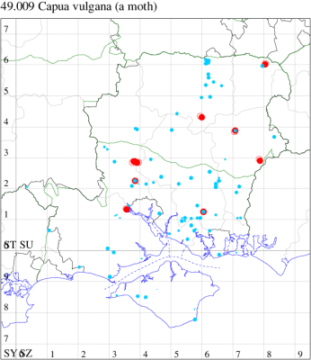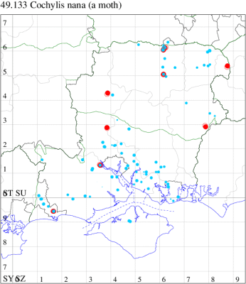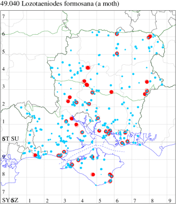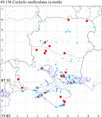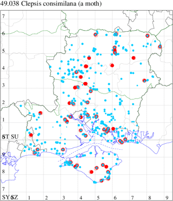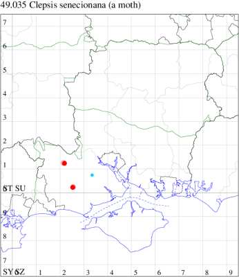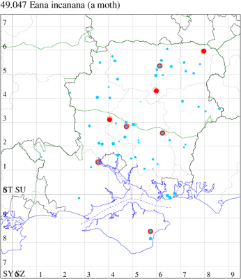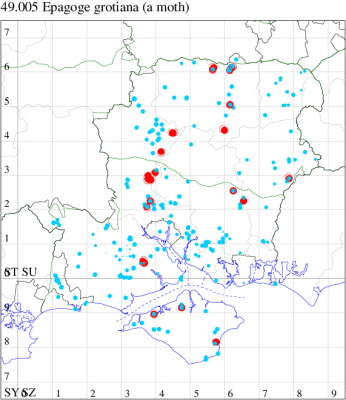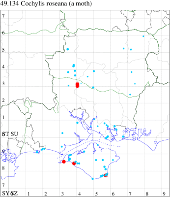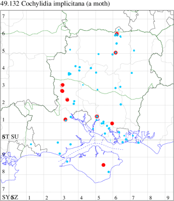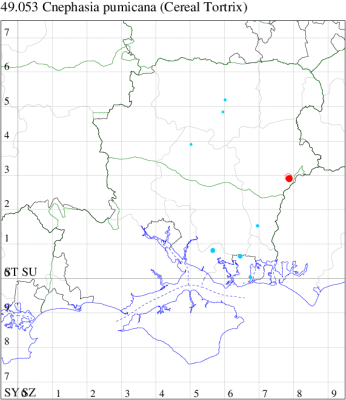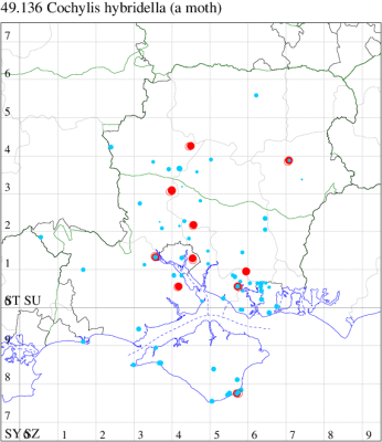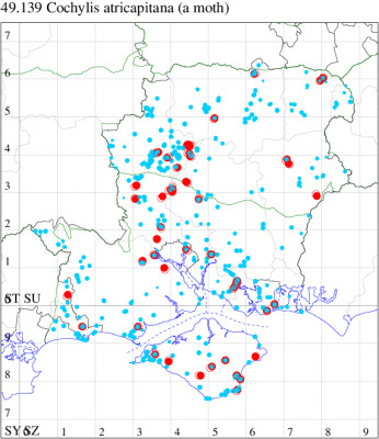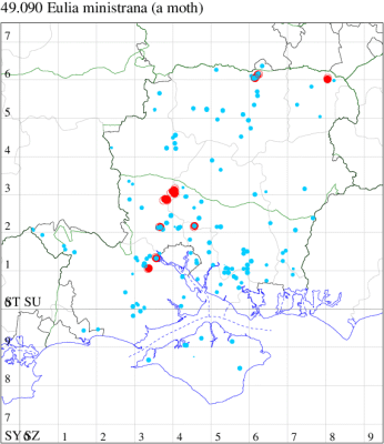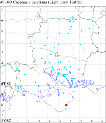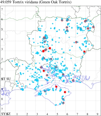 VC11: Brockwood, three, 07 Aug (SDut); Totton, one, 01 Jun; one, 11 Aug (LH); Kings Somborne*, one, to actinic, 31 Jul; Broughton, one, to actinic, 06 Aug; Kings Somborne, one, to actinic, 07 Aug (GCE); Catisfield, one, 06 Aug (ALR det. RJD); Fareham, one, 11 Aug (IMcP); one, to actinic, 05 Aug (MLO); Wickham, one, 07 Aug (F.M.G. det. RJD); Portsmouth, two, 21 May; one, 26 May; three, 01 Jun; five, 02 Jun; 10, 07 Jun; one, 08 Jun; one, 09 Jun; four, 10 Jun; four, 12 Jun; three, 13 Jun; one, 14 Jun; six, 15 Jun; two, 16 Jun; six, 17 Jun; three, 18 Jun; one, 19 Jun; two, 20 Jun; two, 21 Jun; four, 22 Jun; three, 24 Jun; three, 25 Jun; one, 26 Jun; one, 30 Jun; one, 07 Jul; one, 08 Jul; one, 22 Jul; one, 23 Jul; four, 29 Jul; one, 30 Jul; six, 31 Jul; one, 01 Aug; six, 02 Aug; three, 03 Aug; three, 04 Aug; 17, 05 Aug; four, 06 Aug; 15, 07 Aug; 15, 08 Aug; 28, 09 Aug; four, 10 Aug; 21, 12 Aug; 16, 13 Aug; five, 16 Aug; four, 18 Aug; one, 20 Aug; two, 23 Aug; four, 24 Aug; three, 25 Aug; two, 26 Aug; one, 07 Sep; one, 12 Sep; one, 13 Sep; one, 28 Sep (IRT); Burton, nr Christchurch, one, 29 Jul (JSw); Pennington, two, 05 Aug (RFC); Southsea, one, 10 Aug (JGe);