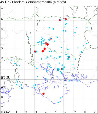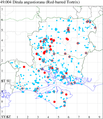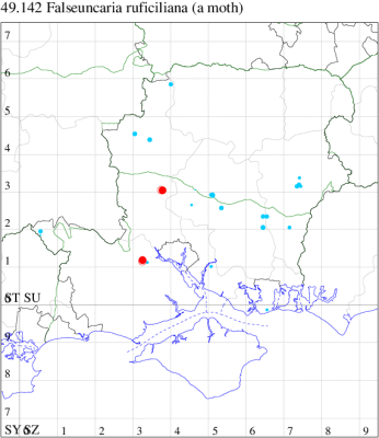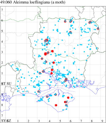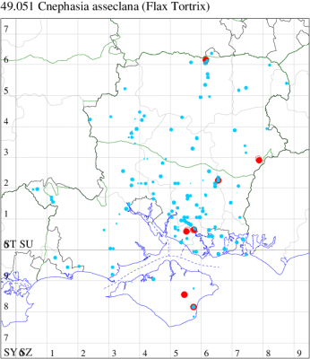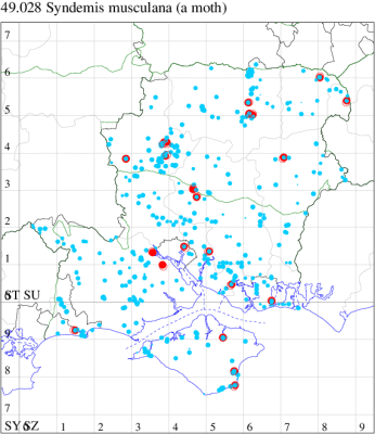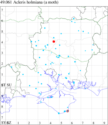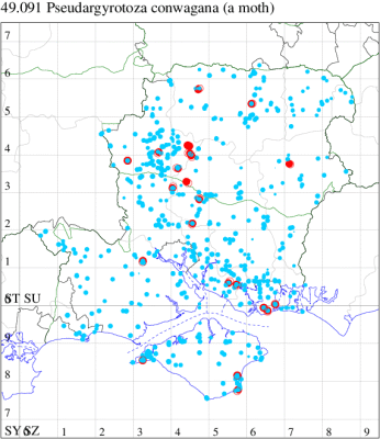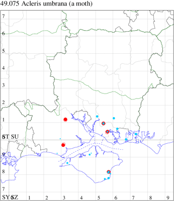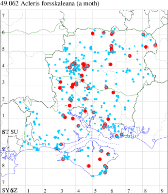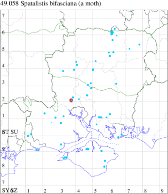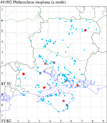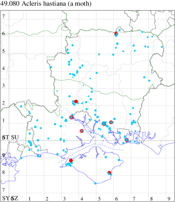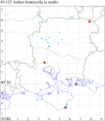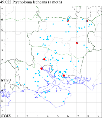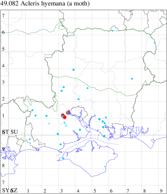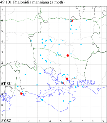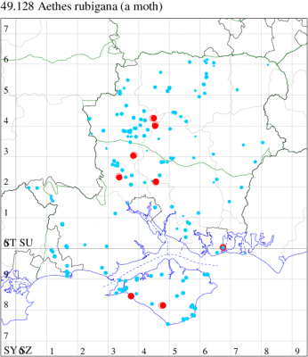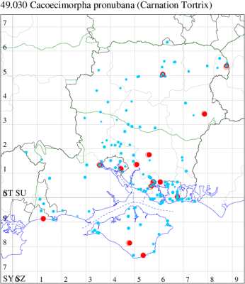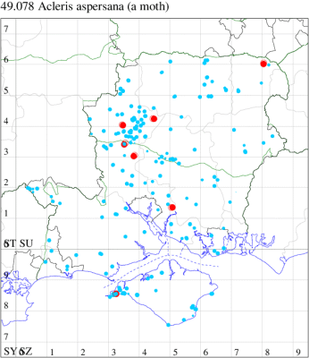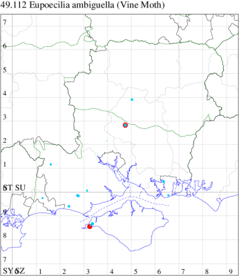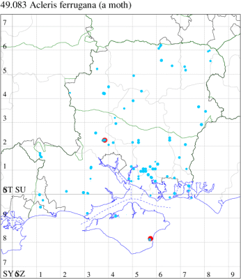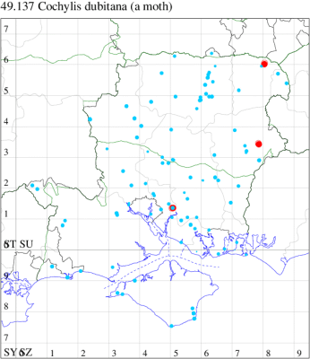 VC11: Brockwood, three, 07 Aug (SDut); Totton, one, 01 Jun; one, 11 Aug (LH); Kings Somborne*, one, to actinic, 31 Jul; Broughton, one, to actinic, 06 Aug; Kings Somborne, one, to actinic, 07 Aug (GCE); Catisfield, one, 06 Aug (ALR det. RJD); Fareham, one, 11 Aug (IMcP); one, to actinic, 05 Aug (MLO); Wickham, one, 07 Aug (F.M.G. det. RJD); Portsmouth, two, 21 May; one, 26 May; three, 01 Jun; five, 02 Jun; 10, 07 Jun; one, 08 Jun; one, 09 Jun; four, 10 Jun; four, 12 Jun; three, 13 Jun; one, 14 Jun; six, 15 Jun; two, 16 Jun; six, 17 Jun; three, 18 Jun; one, 19 Jun; two, 20 Jun; two, 21 Jun; four, 22 Jun; three, 24 Jun; three, 25 Jun; one, 26 Jun; one, 30 Jun; one, 07 Jul; one, 08 Jul; one, 22 Jul; one, 23 Jul; four, 29 Jul; one, 30 Jul; six, 31 Jul; one, 01 Aug; six, 02 Aug; three, 03 Aug; three, 04 Aug; 17, 05 Aug; four, 06 Aug; 15, 07 Aug; 15, 08 Aug; 28, 09 Aug; four, 10 Aug; 21, 12 Aug; 16, 13 Aug; five, 16 Aug; four, 18 Aug; one, 20 Aug; two, 23 Aug; four, 24 Aug; three, 25 Aug; two, 26 Aug; one, 07 Sep; one, 12 Sep; one, 13 Sep; one, 28 Sep (IRT); Burton, nr Christchurch, one, 29 Jul (JSw); Pennington, two, 05 Aug (RFC); Southsea, one, 10 Aug (JGe);