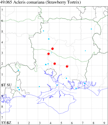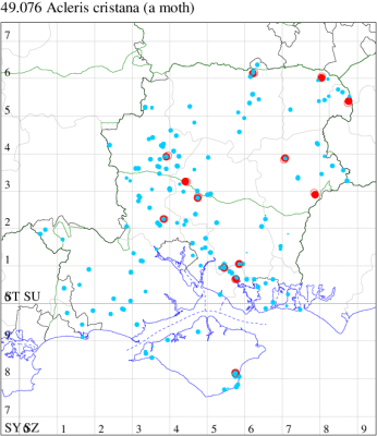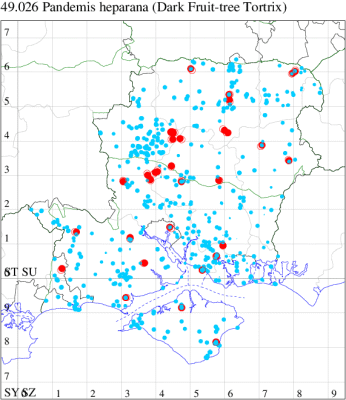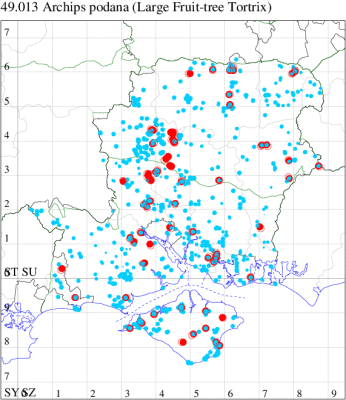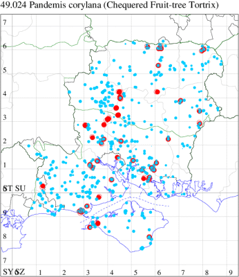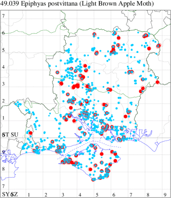 For the maps, all records prior to 2020 are shown by a blue dot (the larger the dot, the more recent), with the current year's records shown in red. As previous records are superimposed on any report for 2020, new sites have greater emphasis (i.e. will show as 'more red').
