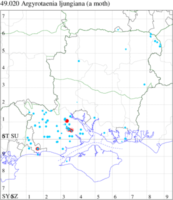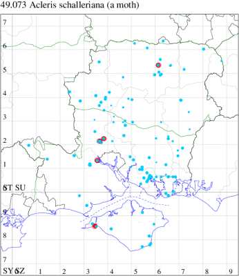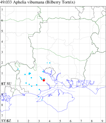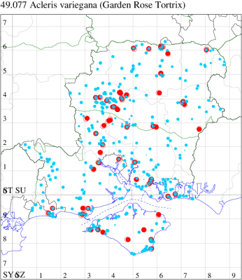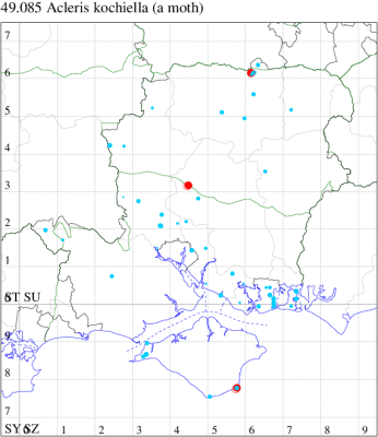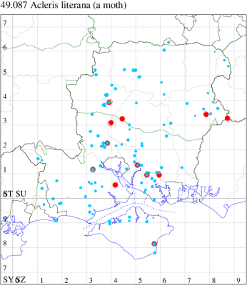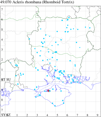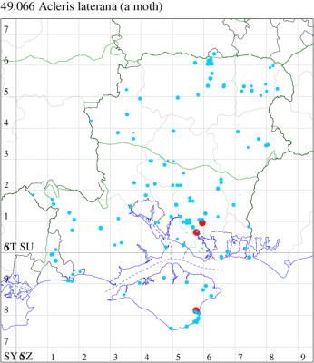 VC10: Cranmore, present, to actinic, 10 Jun (CHic); Parkhurst Forest, six, 29 Jun (IOu); Bonchurch, one, 20 Jun (JHa); Borthwood Copse, Winford, nine, 23 Jun; Shanklin, one, 15 Jun; one, 17 Jun; three, 24 Jun; four, 25 Jun; Borthwood Copse, Winford, six, 23 Jun (IOu); Broadley Copse, six, to actinic, 25 Jun (JBa); Westridge, larva, one, field observation, rolled leaf on Sycamore, 07 May (IOu);