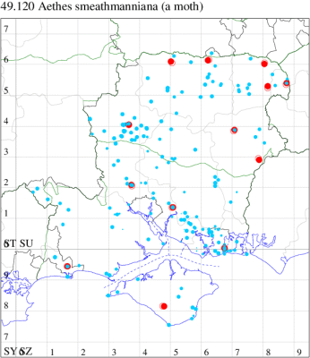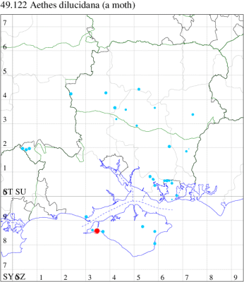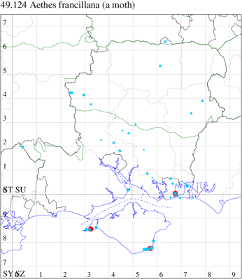 Nationally scarce (Nb) on downland and waste ground in southern England, with records north to Lancashire and Yorkshire. In Hampshire scattered records on the chalk from Cholderton and Martin in the west to Selborne and Oxenbourne Down in the east, and on the chalk north of Portsmouth. On the Isle of Wight, there have been a few records in recent years. Wingspan 12-15 mm. Distinguished from A. francillana and A. beatricella by having the median fascia of the forewing obsolescent in the costal half [Bradley]. Larva feeds on seeds of Wild Parsnip and Hogweed, living between seeds spun together with silk.