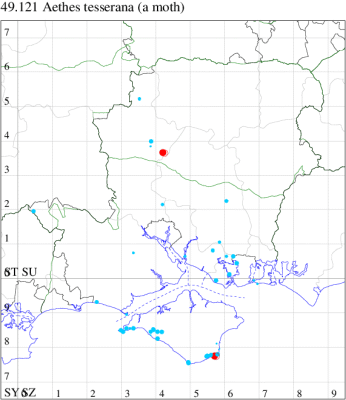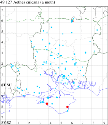 Common on waste ground and dry open areas throughout the British Isles. In our area reasonably well-distributed, including the Isle of Wight in recent years. Wingspan 15-19 mm. Distinguished from A. cnicana by its usually larger size and the broader, more oblique and almost invariably clearly interrupted, median fascia of the forewing [Bradley]. Larva feeds within seedheads of Greater and Lesser Burdock.