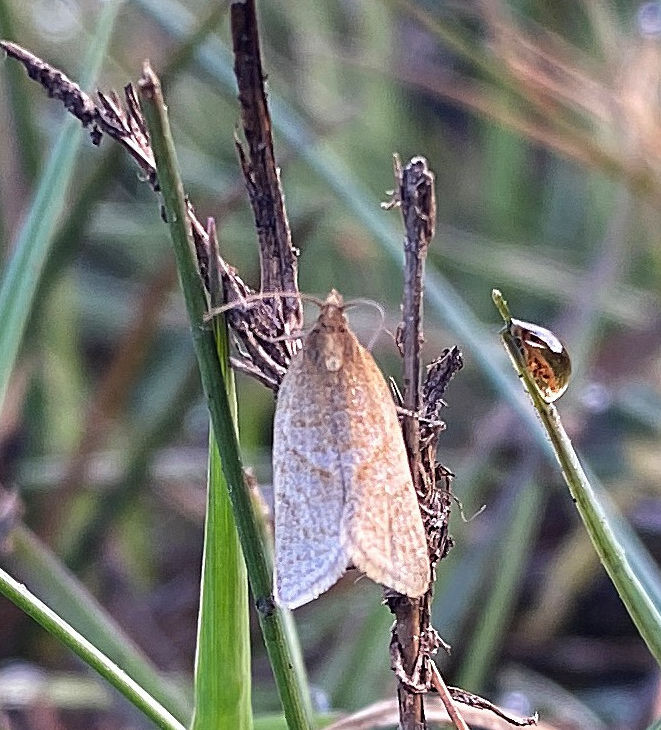 Common in a wide range of habitats, including gardens, orchards, hedgerows and woodland, throughout England and Wales. Well distributed across much of Hampshire and on the Isle of Wight. Wingspan male 19-23 mm, female 20-28 mm. The male lacks the purple-brown ground colour of the forewing of A. oporana; the female is more similar to A. betulana but readily distinguished by the orange coloration in the apical half of the hindwing [Bradley]. Larva polyphagous on a wide variety of deciduous trees and shrubs, even occasionally on conifers, living within a spun or rolled leaf, and sometimes a pest on Apple trees.