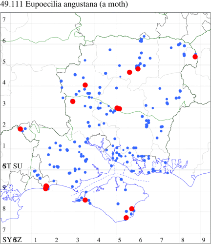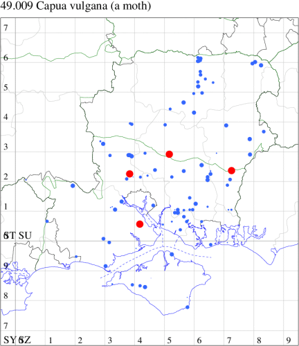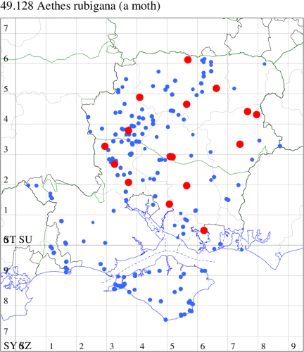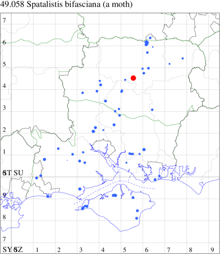 VC11: Earliest: Lee, 09 Apr, 1 (CTha) Latest: Burton, nr Christchurch, 15 Sep, 1 (JStw) Max count: Hengistbury Head NNR, 09 Aug, 5 (BKin)