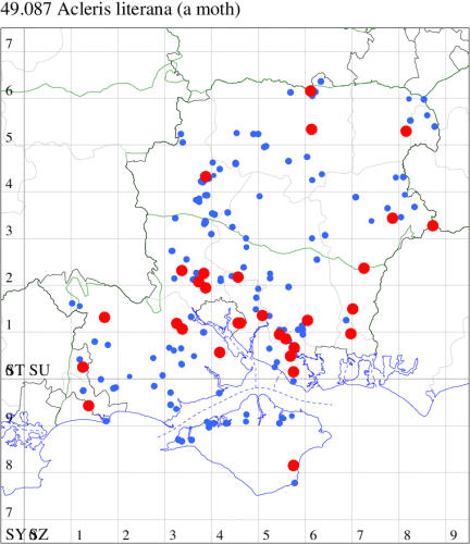 Local in woodland throughout the British Isles, but not in northern Scotland. In Hampshire and on the Isle of Wight found in mature woodland and widely distributed in such habitat. Wingspan male 19-25 mm, female 24-30 mm. The large size and distinctive olive-brown markings are characteristic of this species [Bradley]. Larva feeds on various deciduous trees and shrubs, living within a spun or rolled leaf.