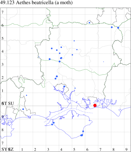 Nationally scarce (Nb) on downland and waste ground in southern England, with records north to Lancashire and Yorkshire. In Hampshire scattered records on the chalk from Cholderton and Martin in the west to Selborne and Oxenbourne Down in the east, and on the chalk north of Portsmouth. On the Isle of Wight, there have been a few records in recent years. Wingspan 12-15 mm. Distinguished from A. francillana and A. beatricella by having the median fascia of the forewing obsolescent in the costal half [Bradley]. Larva feeds on seeds of Wild Parsnip and Hogweed, living between seeds spun together with silk.