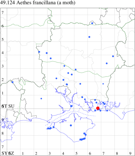 Local on waste ground, in woodland edges and hedgerows throughout much of England and Wales. In Hampshire infrequently recorded and nowhere common, but has been recorded several times from Southsea; first recorded from the Isle of Wight in 2015. Wingspan 14-17 mm. Distinguished from A. francillana by the broader and less oblique median and postmedian fasciae of the forewing [Bradley]. Larva feeds within stems of Hemlock.