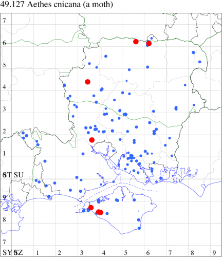 Common on waste ground and dry open areas throughout the British Isles. In our area reasonably well-distributed, including the Isle of Wight in recent years. Wingspan 15-19 mm. Distinguished from A. cnicana by its usually larger size and the broader, more oblique and almost invariably clearly interrupted, median fascia of the forewing [Bradley]. Larva feeds within seedheads of Greater and Lesser Burdock.