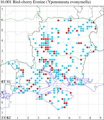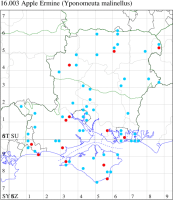 Local in orchards throughout much of Britain as far north as the central lowlands of Scotland, but less common than formerly, probably because of the extensive use of insecticides (MBGBI Vol 3). Widespread at low numbers across Hampshire and Isle of Wight, but there can be limited confidence about the accuracy of many records as the adult moth cannot be reliably differentiated from Y. padella as an imago: although Orchard Ermine Y. padella is normally greyish while the present species has a white ground colour to the forewing, but the two species only reliably separated with reference to the larval foodplant. Specimens should be recorded as Yponomeuta padella/malinellus agg., unless it is made clear that they were recorded as an occupied larval web or reared from the relevant larval foodplant. Larva feeds on Apple, living gregariously within a silken web.