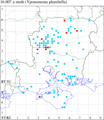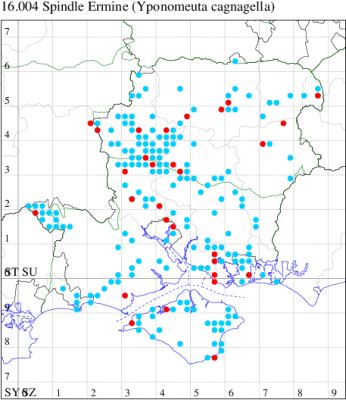 Common wherever the foodplant occurs, on calcareous soils throughout the British Isles, less so in the north and not recorded north of Aberdeen (MBGBI Vol 3). In Hampshire and on the Isle of Wight fairly common and widely distributed. Wingspan 19-26 mm. Distinguished from Orchard Ermine Y. padella and Apple Ermine Y. malinellus by the white forewings with white terminal cilia. Larva feeds on Spindle and, in gardens, Evergreen Spindle, living gregariously within a silken web.