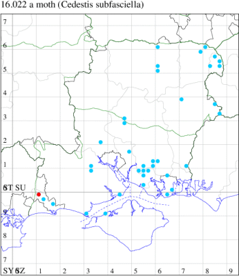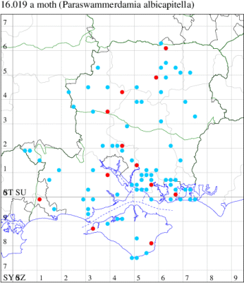 VC11: Broughton, one, 25 Jul (GCE); Stanbrige Earls, one, 04 Aug (JRM); Swaythling, Southampton, one, 27 Jul (MEdg); Southampton, one, 03 Aug (MGP); Allbrook, one, 17 Jul (SIng); Winchester, three, 25 Jul (THW); Fareham, one, 21 Jul; one, 01 Aug (ADT); four, gen det, 01 Aug; one, 09 Aug; one, 10 Aug; one, 17 Aug; one, 28 Aug; one, 29 Aug; one, 31 Aug (MLO); Portsmouth, one, 13 Jul; one, 22 Jul; one, 10 Aug; two, 11 Aug; one, 19 Aug; one, 20 Aug (IRT); West Walk, two, female (26 mm wingspan) and male, 23 Jul (RJD, MLO, ADT, DWal, KJW); Pennington, one, 19 Jul; 10, 24 Jul (RFC);
