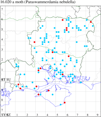 Common in hedgerows and scrubland throughout the British Isles. In Hampshire and on the Isle of Wight widespread and sometimes common, especially as larvae. Wingspan 19-22 mm. Reliable identification is best based on the caterpillar's host plant: