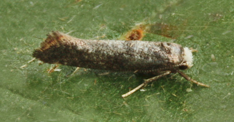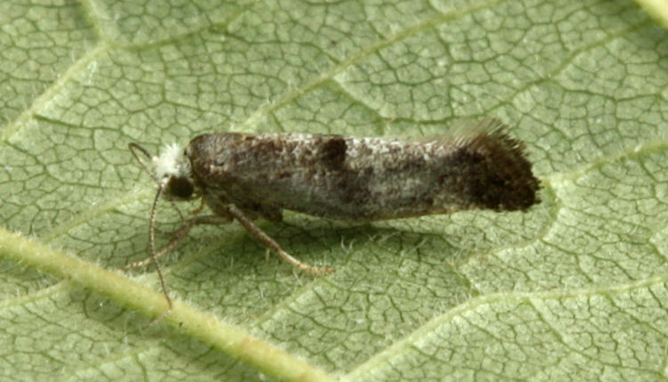 Common in hedgerows and open woodland throughout the British Isles, but not in the north. The distribution in Hampshire mirrors those areas in which trapping effort is concentrated, and the moth is probably more widely distributed than the records suggest; only recorded once on the Isle of Wight. Wingspan 11-14 mm. Characterised by the absence of distinguishing field characteristics, predominately grey, with a white head. Larva mines leaves of Hawthorn, Rowan and Dog Rose, subsequently living within a silken web, often several together.