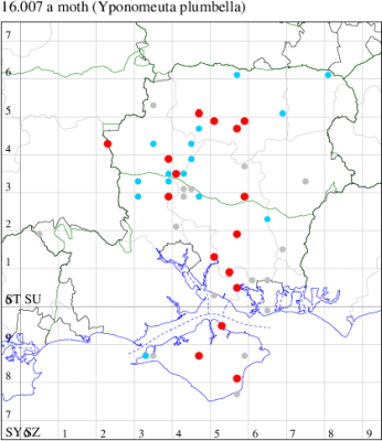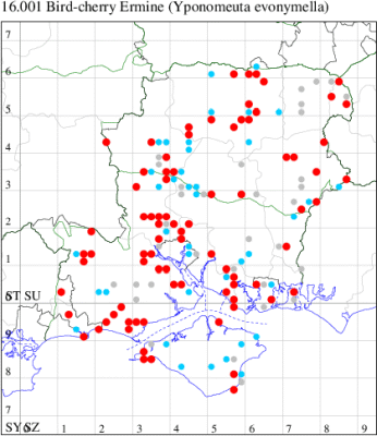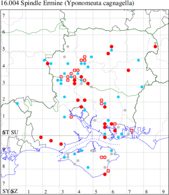 VC11: Marchwood, larva, 10, field observation, on Spindle, 29 Apr (PGS); Marsh Court, Stockbridge, larval web, one, field observation, 15 May; Stockbridge Common , larval web, one, field observation, 15 May; Ashley, one, 11 Jul; Winter Down Copse, Little Somborne, one, 12 Jul; one, 12 Jul (GCE); Swaythling, Southampton, five, 17 Jul (MEdg); Vale Park, Chandler's Ford, one, 27 Jul; three, 31 Jul (KArb); Allbrook, one, 09 Jul; four, 12 Jul; two, 19 Jul; one, 20 Jul; one, 22 Jul; one, 09 Aug (SIng); Fareham, one, 18 Aug (ADT det. RJD); one, 11 Jul; two, 13 Jul; four, 16 Jul; three, 18 Jul; one, 20 Jul; three, 21 Jul; two, 27 Jul; one, 30 Jul; one, 03 Aug; two, 04 Aug; one, 20 Aug; one, 27 Aug (MLO); Upham, larva, present, field observation, larvae in webs on spindle, 05 May (DTru); Bishops Waltham, one, 08 Jul; one, 12 Aug (HGil); Upham, larva, present, field observation, large numbers in larval webs on spindle in hedgerow, 05 May (DTru); Portsdown, one, attracted to blossom, feeding on hemp agrimony flower by day on a hot and sunny day, 08 Aug (RJD); Portchester Common SSSI, larva, present, field observation, extensive webs containing scores of larvae, many apparently on dogwood, 30 Apr (GRE det. RJD); larval web, present, on host-plant, extensive webs containing larvae on spindle and dogwood (particularly the former), from which R J Dickson subsequently bred typical Y.cagnagella moths, 02 May (GRE, JWP); Horsea Island, two, 22 Jul (RJD, MLO, ADT, DWal, KJW det. RJD); North Hayling., larval web, 10, on host-plant, larval webs on numerous Euonymus europaeus below the M27 and alongside nearby Hill Road, 09 May (GRE); Thorney Hill, Bransgore, one, 09 Jul (JFen); Sway, one, 27 Jul (S&SLan); Pennington, one, 17 Jul; three, 20 Jul; one, 13 Aug (RFC); Browndown Coastal Ranges, one, 08 Jul (RJD, ADT, DWal & KJW det. RJD); one, 12 Aug (KCok, RJD, MLO, ADT, DWal det. RJD);