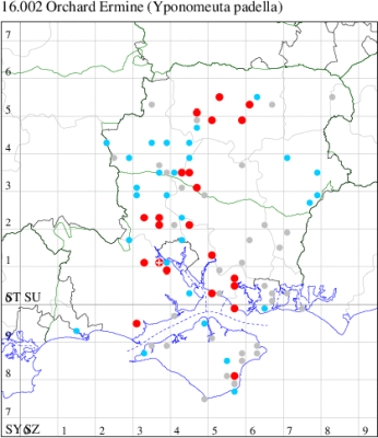Local in orchards throughout much of Britain as far north as the central lowlands of Scotland, but less common than formerly, probably because of the extensive use of insecticides (MBGBI Vol 3). Widespread at low numbers across Hampshire and Isle of Wight, but there can be limited confidence about the accuracy of many records as the adult moth cannot be reliably differentiated from Y. padella as an imago: although Orchard Ermine Y. padella is normally greyish while the present species has a white ground colour to the forewing, but the two species only reliably separated with reference to the larval foodplant. Specimens should be recorded as Yponomeuta padella/malinellus agg., unless it is made clear that they were recorded as an occupied larval web or reared from the relevant larval foodplant. Larva feeds on Apple, living gregariously within a silken web.