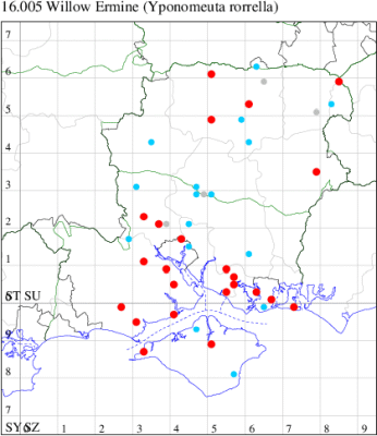 Common wherever the foodplant occurs, on calcareous soils throughout the British Isles, less so in the north and not recorded north of Aberdeen (MBGBI Vol 3). In Hampshire and on the Isle of Wight fairly common and widely distributed. Wingspan 19-26 mm. Distinguished from Orchard Ermine Y. padella and Apple Ermine Y. malinellus by the white forewings with white terminal cilia. Larva feeds on Spindle and, in gardens, Evergreen Spindle, living gregariously within a silken web.