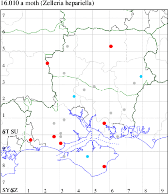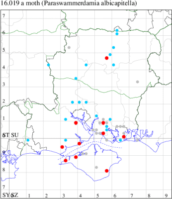 Common in hedgerows and open woodland throughout the British Isles, but not in the north. The distribution in Hampshire mirrors those areas in which trapping effort is concentrated, and the moth is probably more widely distributed than the records suggest; only recorded once on the Isle of Wight. Wingspan 11-14 mm. Characterised by the absence of distinguishing field characteristics, predominately grey, with a white head. Larva mines leaves of Hawthorn, Rowan and Dog Rose, subsequently living within a silken web, often several together.