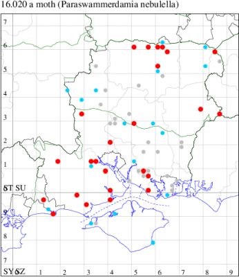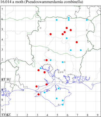 Common in hedgerows and scrubland throughout the British Isles. In Hampshire and on the Isle of Wight widespread and sometimes common, especially as larvae. Wingspan 19-22 mm. Reliable identification is best based on the caterpillar's host plant: