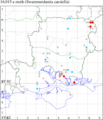 Common in hedgerows and scrub throughout the British Isles. The distribution in Hampshire mirrors those areas in which trapping effort is concentrated, and the moth is probably more widely distributed than the records suggest; very infrequently recorded from the Isle of Wight. Wingspan 13-16 mm. Distinguished from the various Swammerdamia species by the dark-bordered orange spot on the wing-tip, and the rows of fine longitudinal dashes along the length of the forewing. Larva mines the foliage of Blackthorn, subsequently living within a silken web, often several together, over-wintering as a pupa in a cocoon.