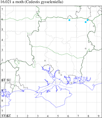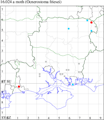 Local in pine woodland throughout much of England and Scotland. In Hampshire the majority of records are from the south of the county, but apparently increasing, or perhaps increasingly recorded, with no less than nine records in 2007. Not recorded from the Isle of Wight to date. Wingspan 8-10 mm. A small and nondescript pale grey moth, very similar to O. piniariella, from which separable only by dissection of the genitalia. Larva mines needles of Scots Pine, living between needles spun together with silk.