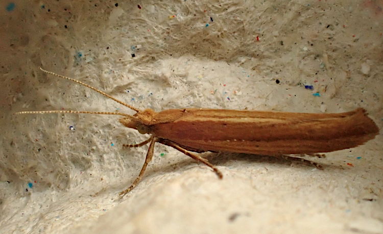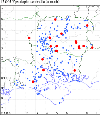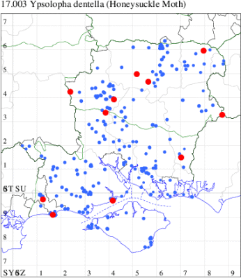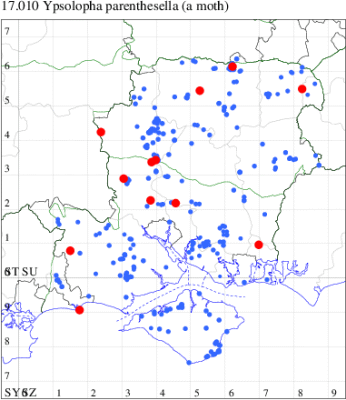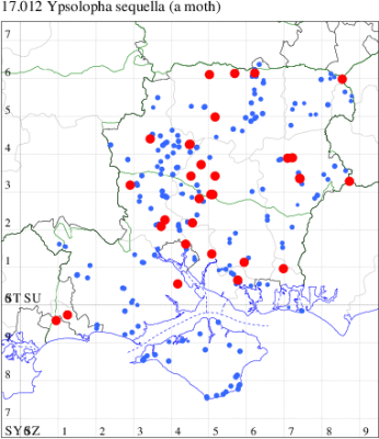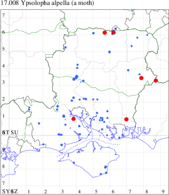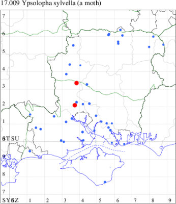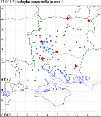 Local in woodland on chalky soils throughout southern England. Fairly widely distributed across Hampshire, wherever the foodplant is found, but decidedly uncommon on the Isle of Wight. Wingspan 26-33 mm. The distinctive attenuated resting posture is shared by a few other species of Ypsolopha, and most closely resembles Y. nemorella, which has a distinct dark spot on the forewing. Larva feeds on Spindle, beneath a silken web.