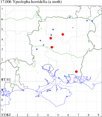 Nationally scarce (Nb) in open woodland and gardens throughout southern England and northern Wales. Barely annual in Hampshire, where recorded widely, but only regular on the coast in the south-east of the county; very rare on the Isle of Wight. Wingspan 16-21 mm. Positioning and size of scale tufts on dorsum, and fuscous colouring distinguish Y. horridella from its congeners. Larva feeds on Apple and Blackthorn, beneath a silken web, over-wintering as an egg.
