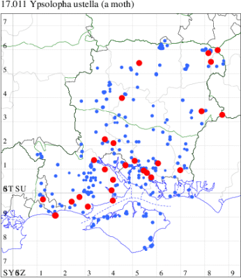 Common in woodland throughout much of the British Isles, except the Outer Hebrides and Shetland. Common and widespread in Hampshire, though Isle of Wight records remain sparse. Wingspan 15-19 mm. Unicolorous forms can be distinguished from similar forms of Y. ustella
