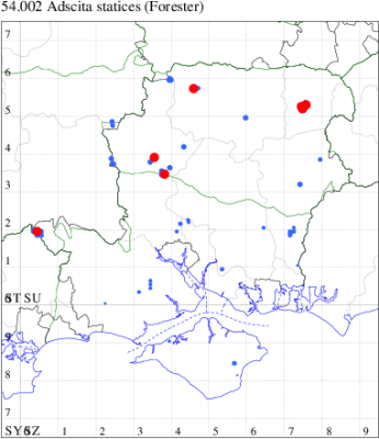 For the maps, all records prior to 2023 are shown by a blue dot (the larger the dot, the more recent), with the current year's records shown in red. As previous records are superimposed on any report for 2023, new sites have greater emphasis (i.e. will show as 'more red').