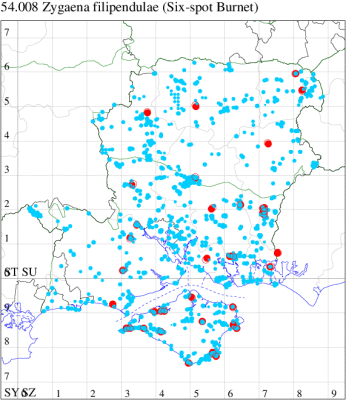 Common on flower meadows, roadside verges, downland, woodland rides and sand-dunes throughout the British Isles, predominantly coastal in the north of its range. In Hampshire and on the Isle of Wight by far the commonest and most widely distributed burnet moth, about four times more numerous than the second most frequent burnet moth, Narrow-bordered Five-spot Burnet Z. lonicerae. Wingspan 25-39 mm. Day-flying. Unmistakable — no other British species of burnet moth has six spots. Larva feeds on Bird's-foot Trefoil and Horseshoe Vetch, over-wintering at least once.