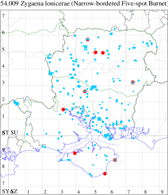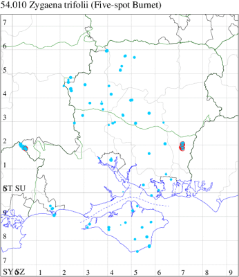 Local on grassland and heathland, and by freshwater margins, throughout much of southern England and Wales. In Hampshire not as widespread as in the past, but still locally present, generally on the chalk, and relatively frequent on the Isle of Wight. Wingspan 24-37 mm. Day-flying. Very difficult to distinguish from the much more widespread Narrow-bordered Five-spot Burnet Z. lonicerae, even using features of genitalia: however, the habitat, time of year and location may help; slightly smaller than Narrow-bordered; examples with the middle pair of spots merged are frequent in Five-spot Burnet, but rare in Narrow-bordered (MBGBI Vol 2). It is very difficult to make a determination based on one individual from photos. Larva feeds on Greater Bird's-foot Trefoil.