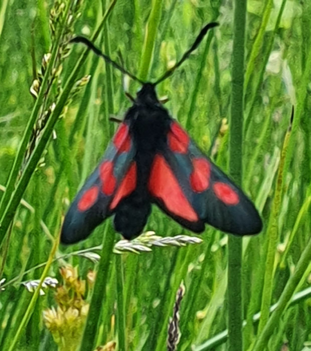 Common on flower meadows, roadside verges, downland, woodland rides and sand-dunes throughout the British Isles, predominantly coastal in the north of its range. In Hampshire and on the Isle of Wight by far the commonest and most widely distributed burnet moth, about four times more numerous than the second most frequent burnet moth, Narrow-bordered Five-spot Burnet Z. lonicerae. Wingspan 25-39 mm. Day-flying. Unmistakable — no other British species of burnet moth has six spots. Larva feeds on Bird's-foot Trefoil and Horseshoe Vetch, over-wintering at least once.